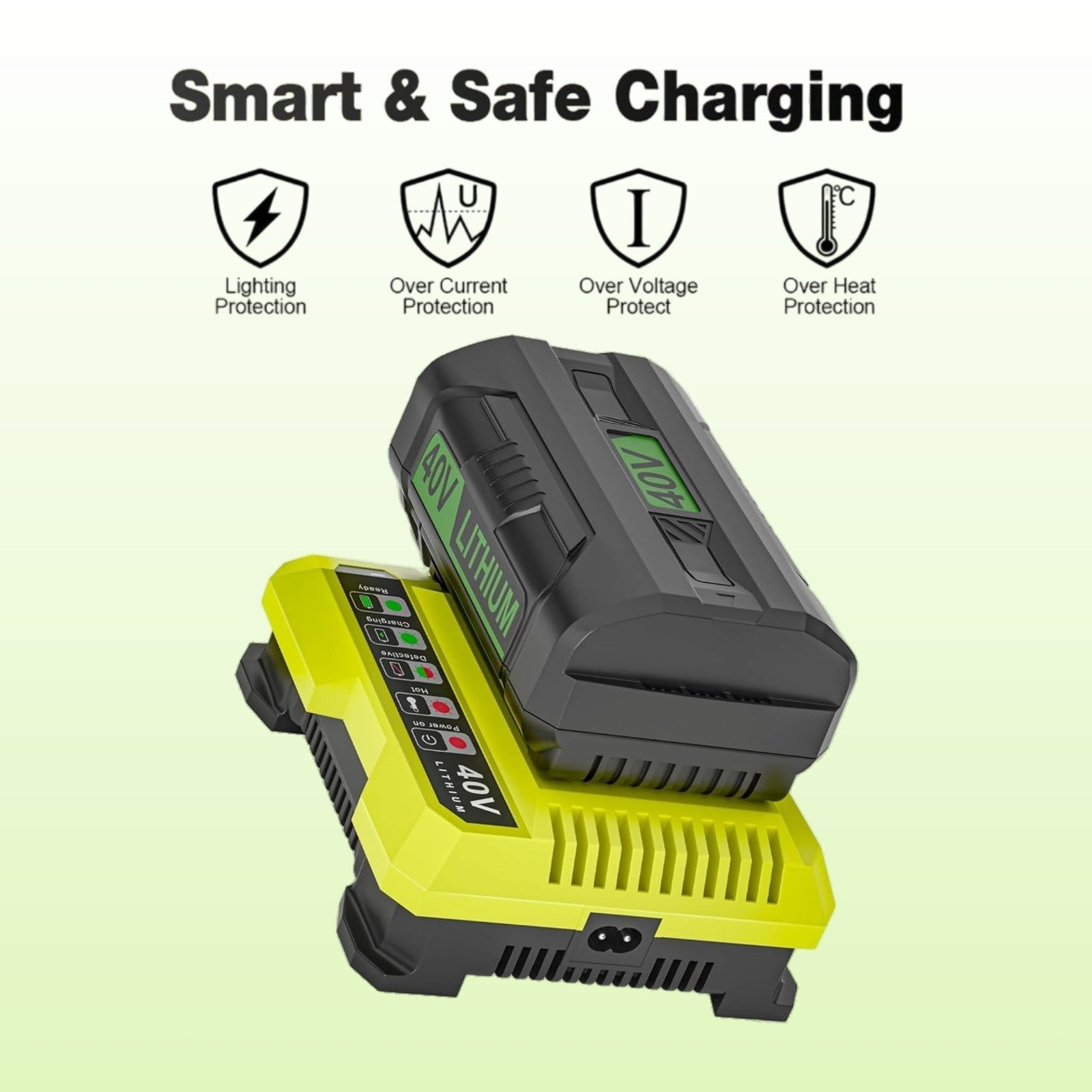 This Ryobi Charger 40V built-in intelligent protection system can monitor each battery status, protect your Ryobi 40V battery from insecurity issues caused by over-charge, over-discharge, over-heating, over-current, over-voltage, short circuit to optimize battery life and make it safer.