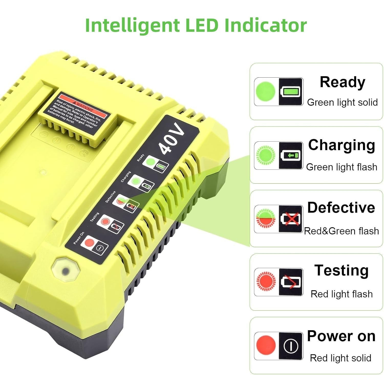 This high-quality replacement charger is specifically designed for Ryobi 40V batteries. It is NOT compatible with Ryobi 18V batteries.